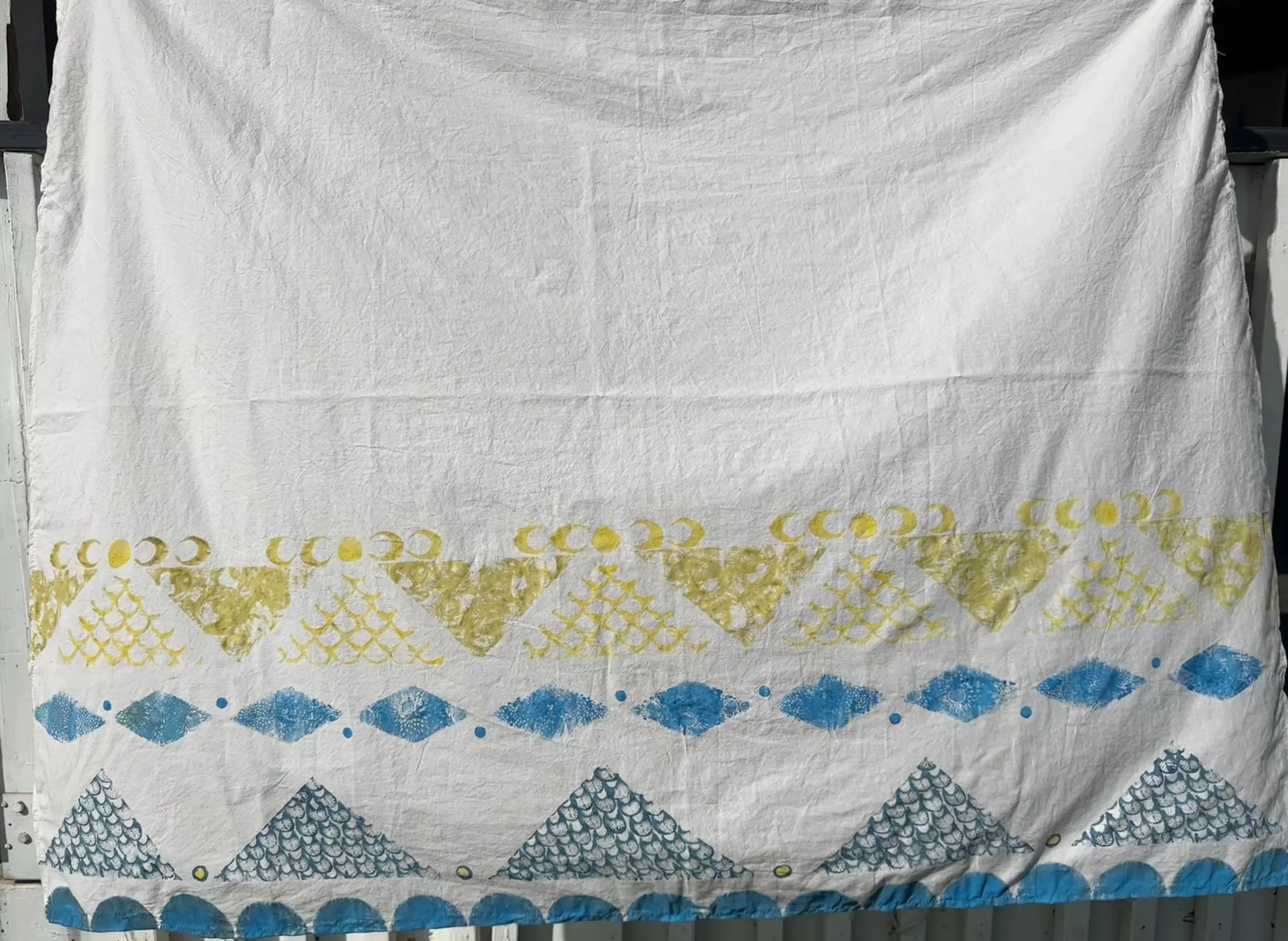 Graduation was a whole other beast. I made a lot of lei and a kihei in preparation for the big day. To make it, I cut a 1.5-yd piece of unbleached muslin, hemmed it on all four sides, ironed it, then printed it with plants from around my aunty’s house. I used the four-stage Ka’ao framework from the University of Hawai‘i system to represent my learning and growth over the past four years: